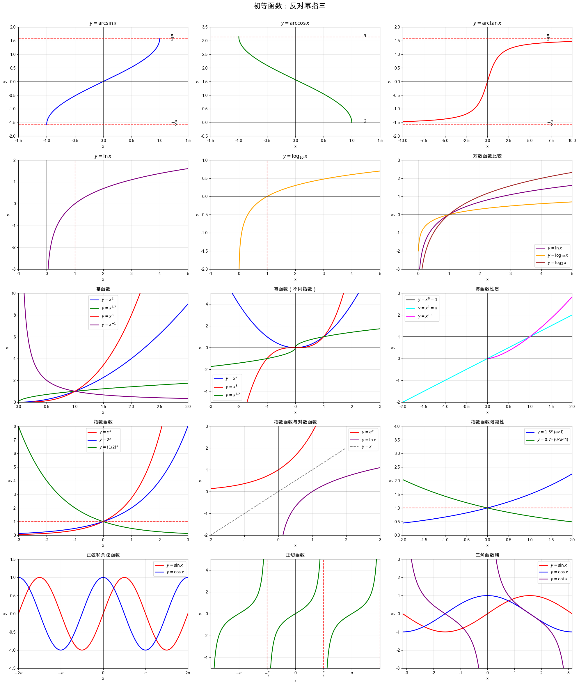 | 反正切 arctan x | (-∞, +∞) | (-π/2, π/2) | ↗ | 奇 | 无 | arctan 0 = 0 |