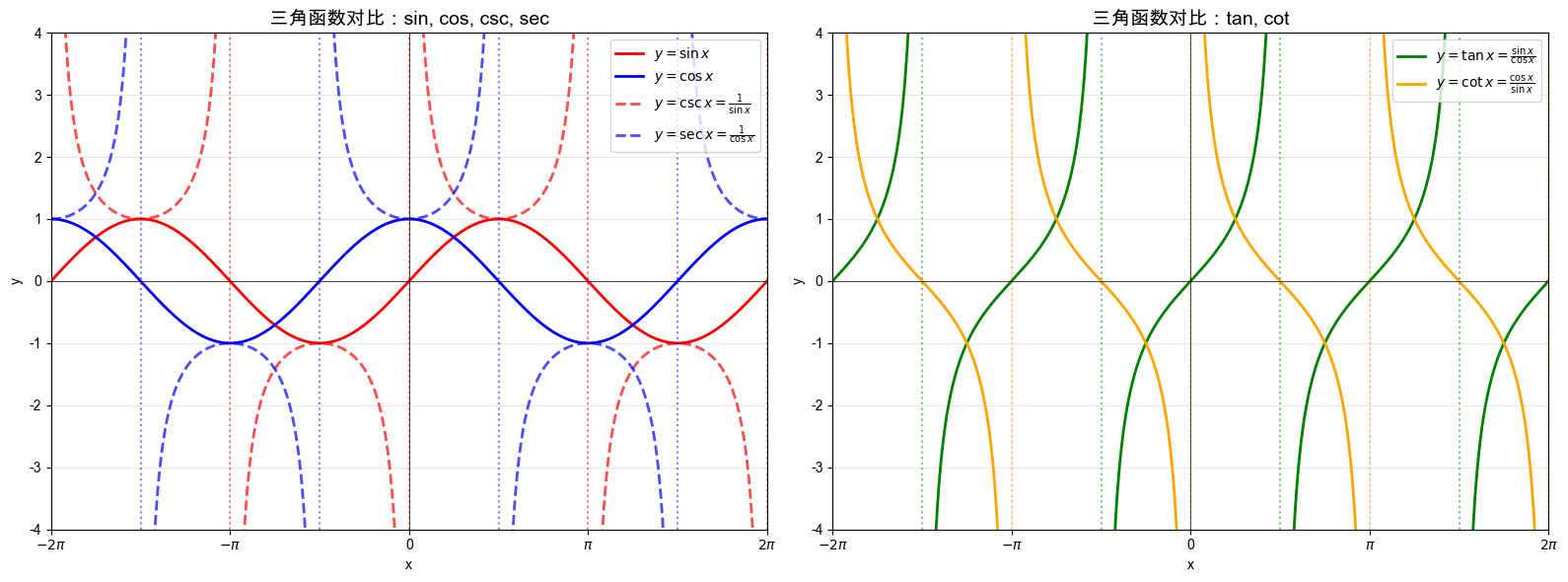 | 正切 tan x | x ≠ kπ + π/2, k∈Z | (-∞, +∞) | 周期性 | 奇 | π | tan 0 = 0 |