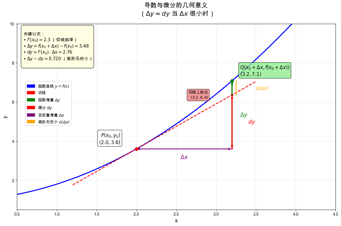 微分 dy=f′(x0)dx 表示当自变量从 x0 变化到 x0+dx 时,曲线 y=f(x) 在点 (x0,f(x0)) 处切线纵坐标的增量。