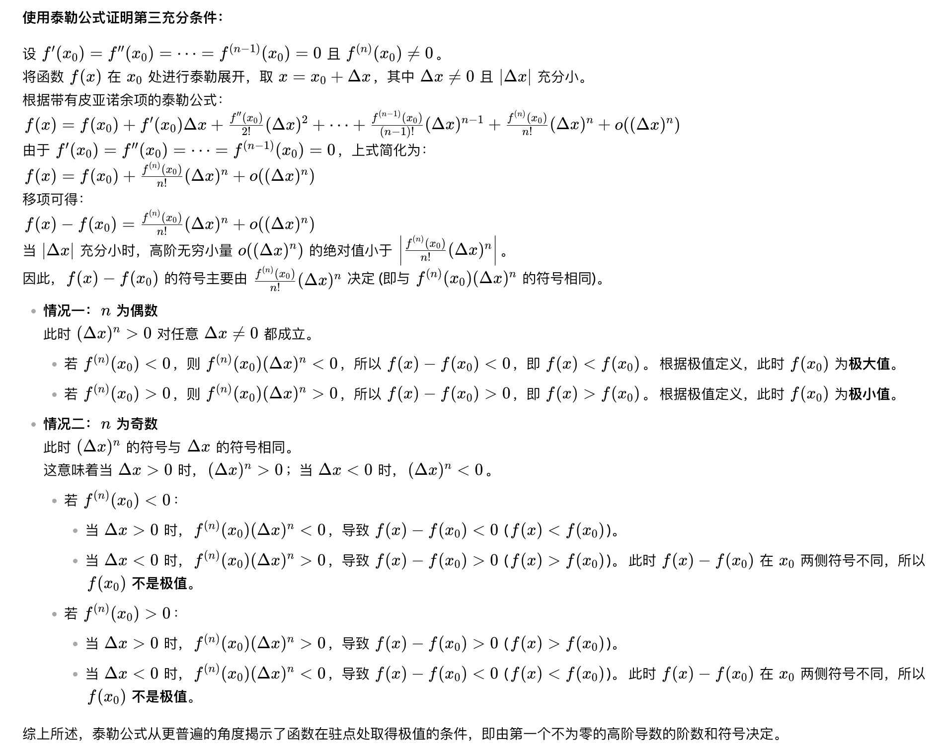 - 带拉格朗日余项的 n 阶泰勒公式(全局泰勒公式): 若 在包含 的区间 上 阶可导,则对任意 ,有: ,其中 在 与 之间。