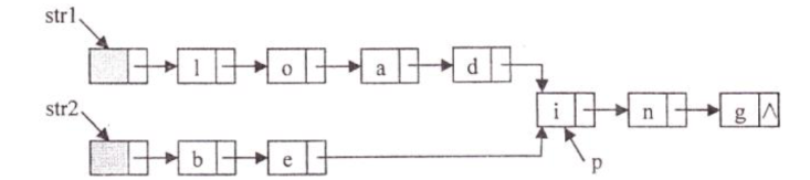 假定采用带头结点的单链表保存单词,当两个单词有相同的后缀时,则可共享相同的后缀存储空间,例如,“loading”和“being”的存储映像如下图所示。