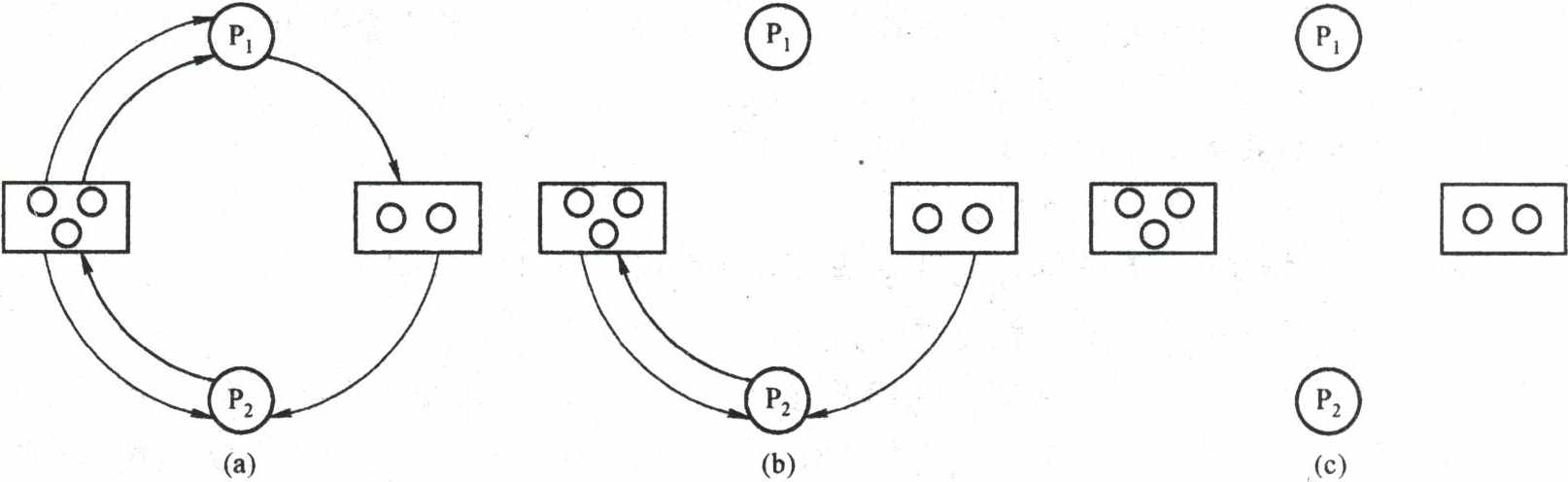- 圆圈代表进程,框表示一类资源