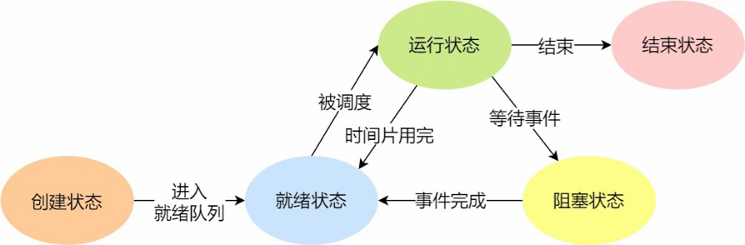 - 就绪态 Ready:进程获得了除处理机外的一切所需资源,一旦得到处理机,就可以立即运行