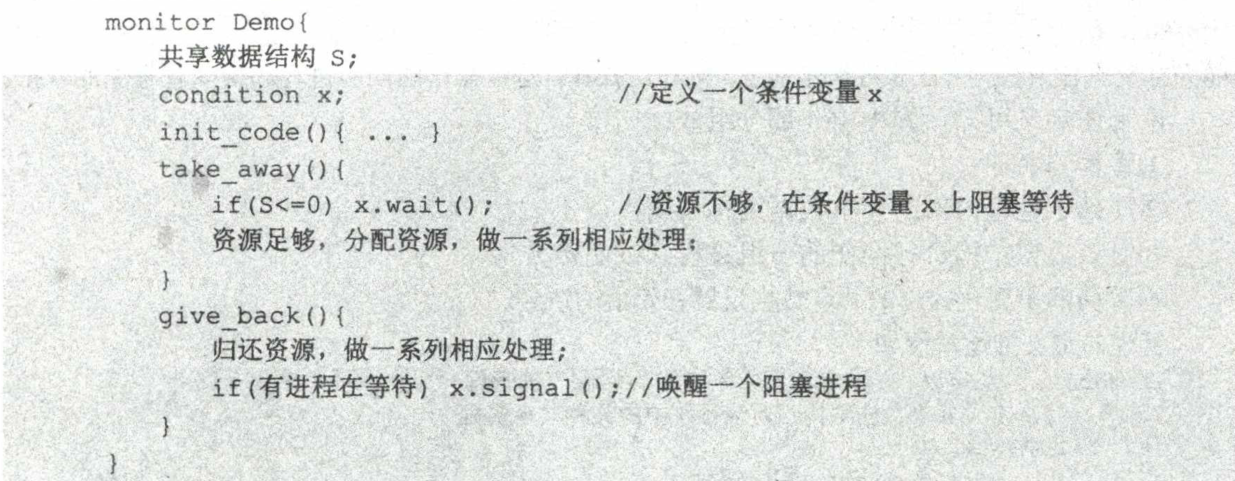 - 定义:将一个进程进入管程后被阻塞的原因定义为条件变量 condition