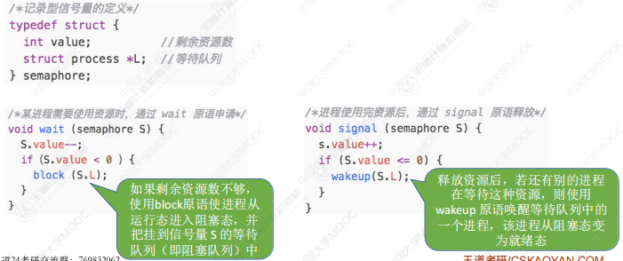 - wait/signal 类似于信号量的 P/V 操作,实现进程的阻塞/唤醒,但不能说和 PV 操作相同