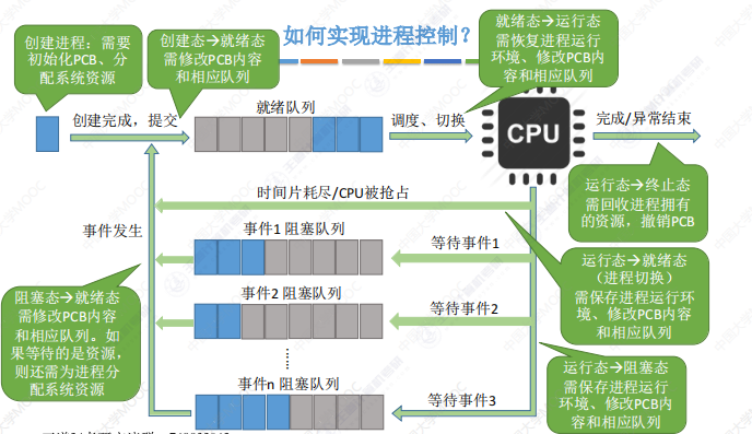 - 进程控制:主要功能是对系统中的所有进程实施有效的管理,具有创建新进程、撤销已有进程、实现进程状态转换等功能