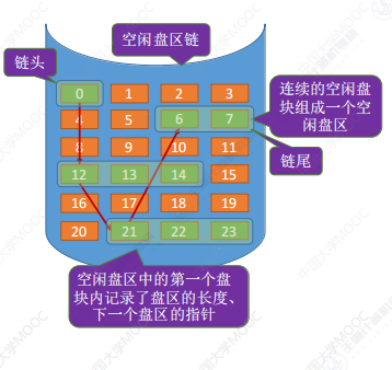 - 指将磁盘上的所有空闲盘区拉成一条链,每个盘区包含若干相邻的盘块
