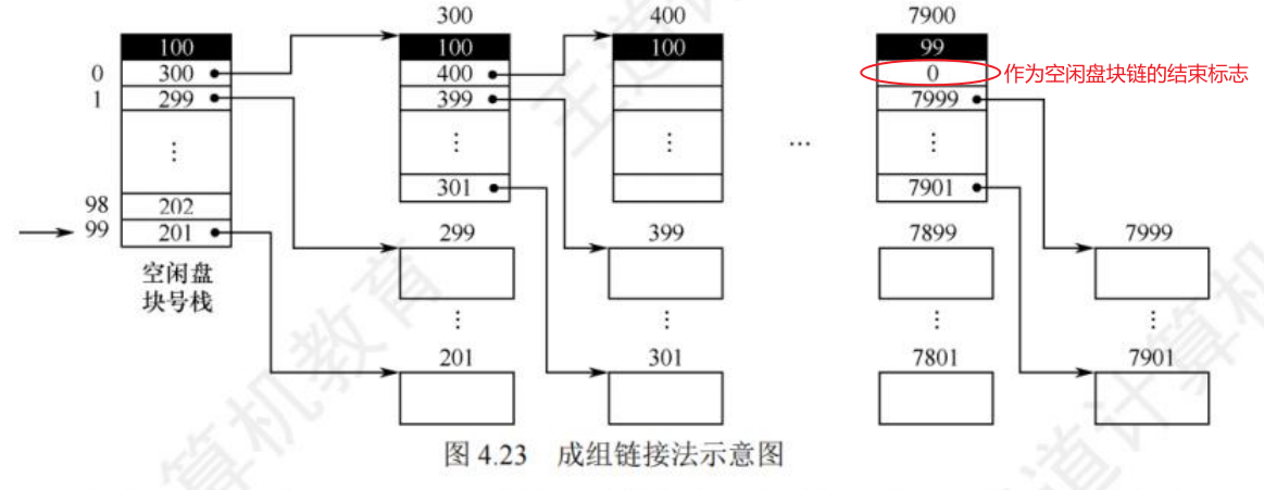 - 当栈中的空闲盘块数已达 100 时,表示栈已满,将现有栈中的 100 个空闲盘块号存入新回收的盘块,并将新回收的盘块号作为新栈底,再将栈中的空闲盘块数置为 1