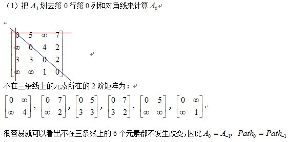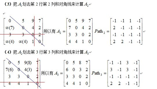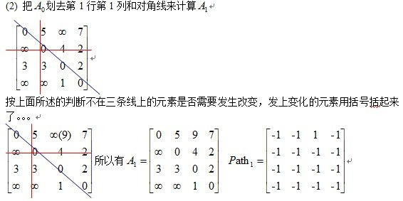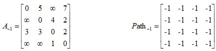 给出矩阵,其中矩阵 A 是邻接矩阵,而矩阵 Path 记录 u,v 两点之间最短路径所必须经过的点