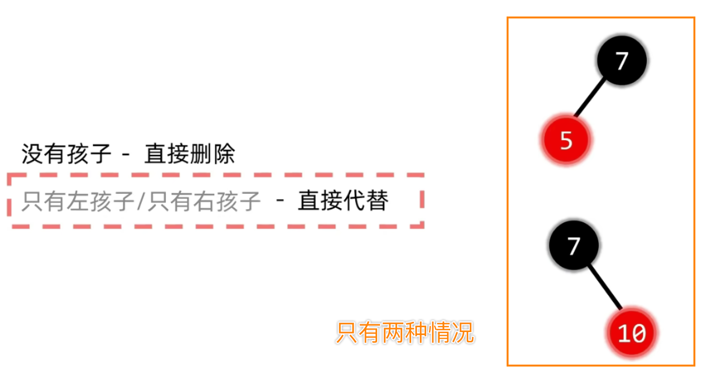 - 只有左孩子/只有右孩子:直接用孩子代替之,然后染黑