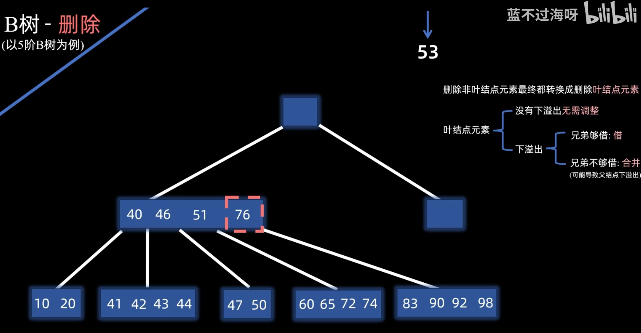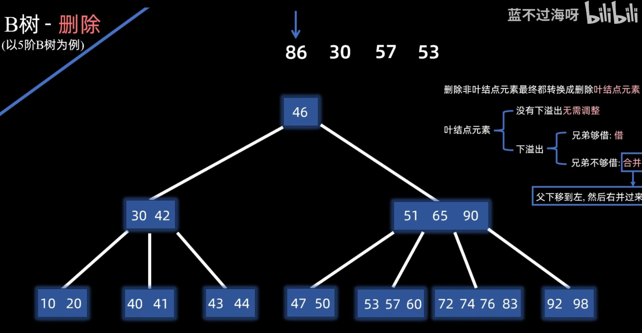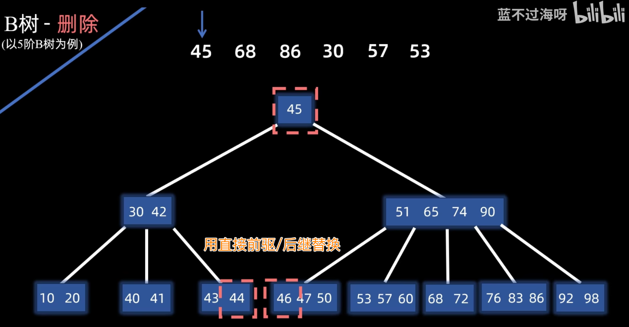 - 然后,将被用来替换的那个前驱或后继关键字从其所在的叶子结点中删除。