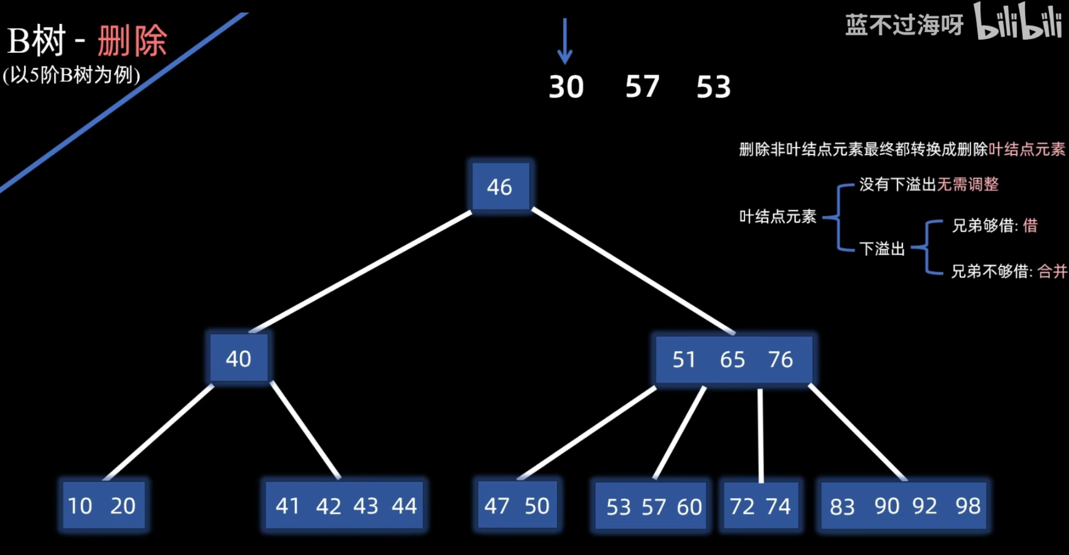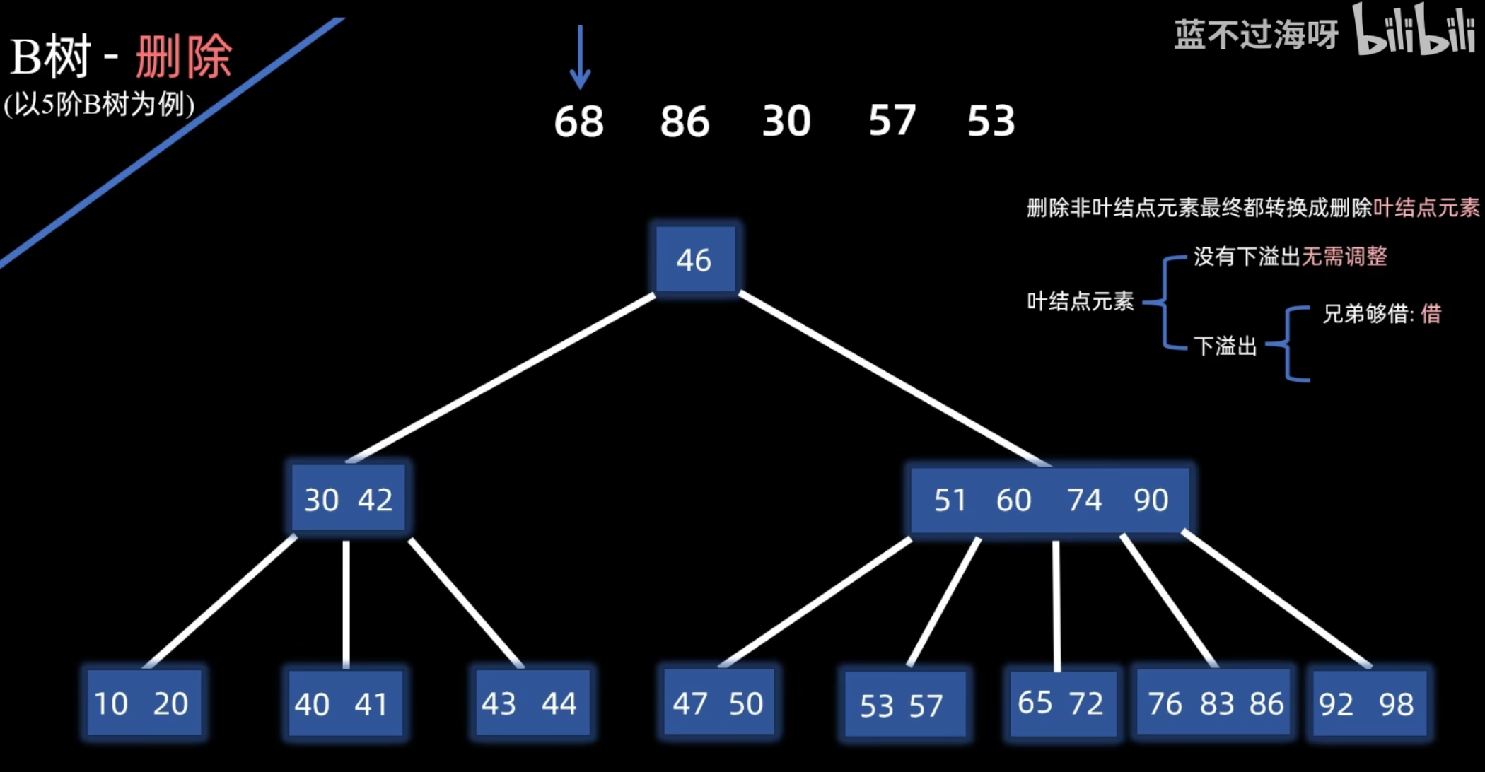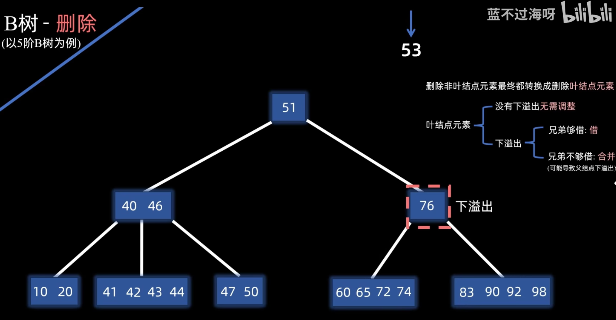 - 然后,将被用来替换的那个前驱或后继关键字从其所在的叶子结点中删除。
