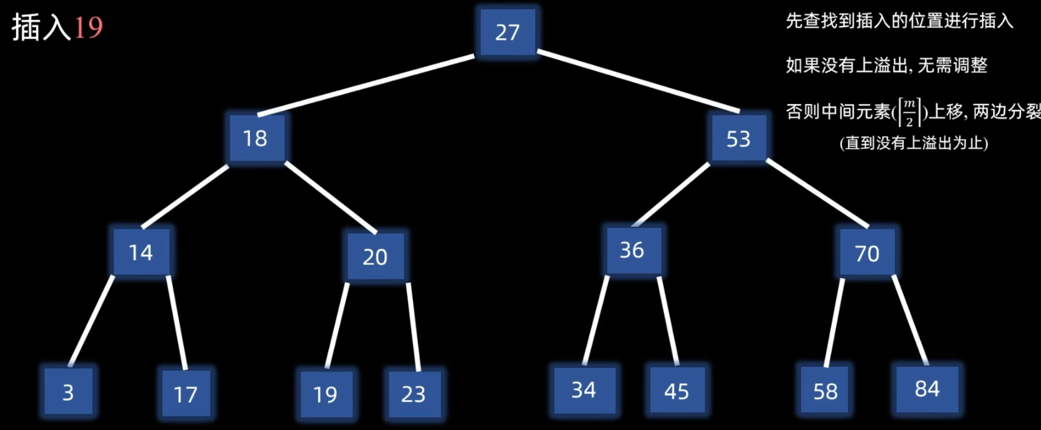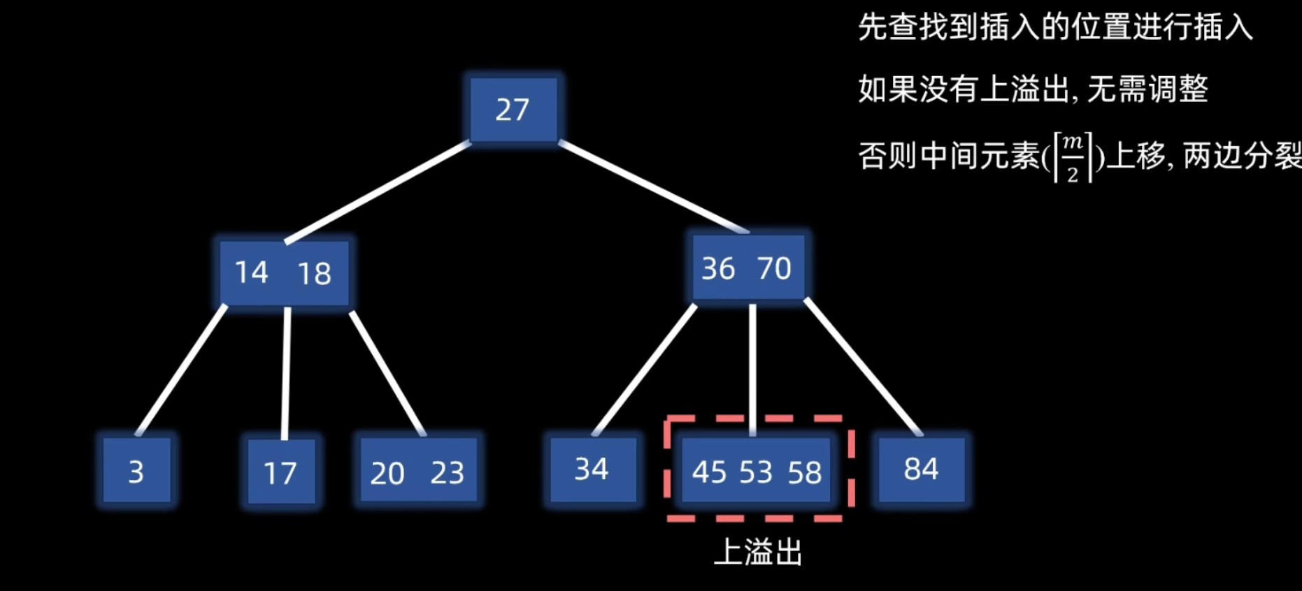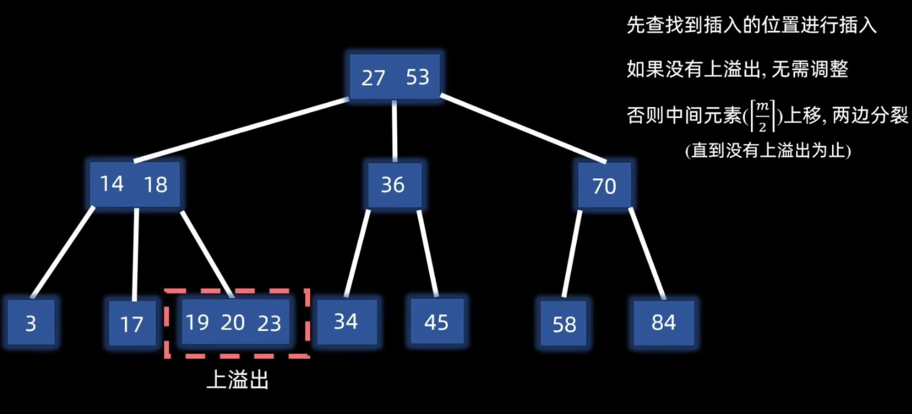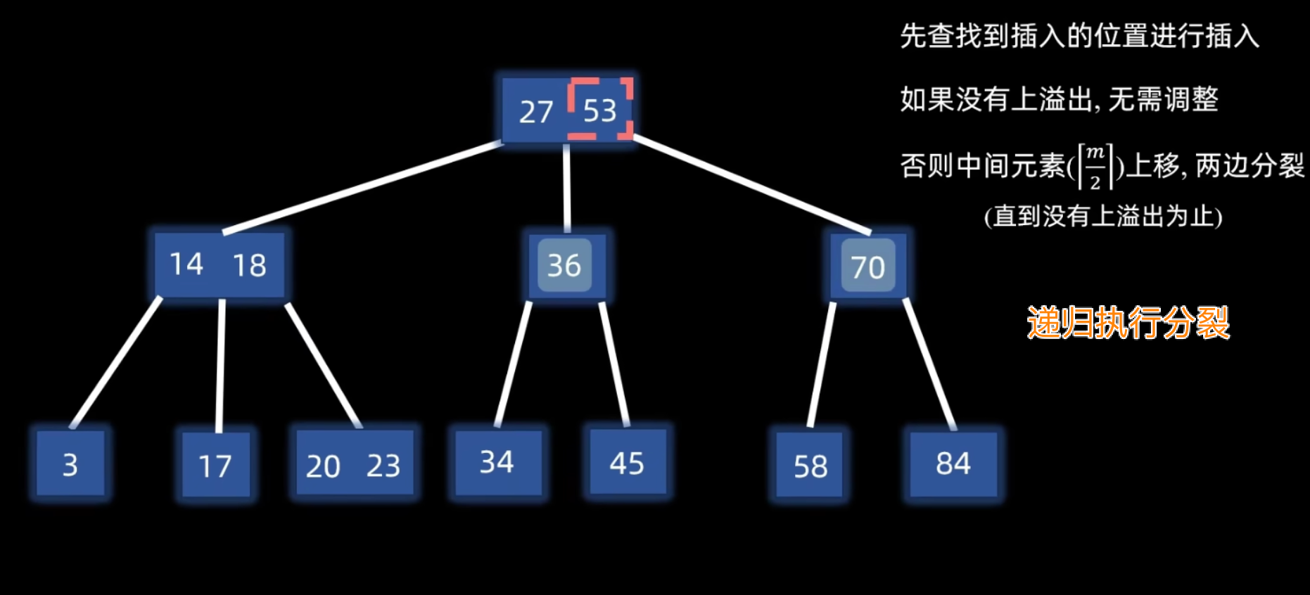 - 递归分裂:如果因关键字提升导致父结点也溢出,则对父结点重复分裂操作,直到不再溢出或分裂到根结点。若根结点分裂,则树的高度增加 1。