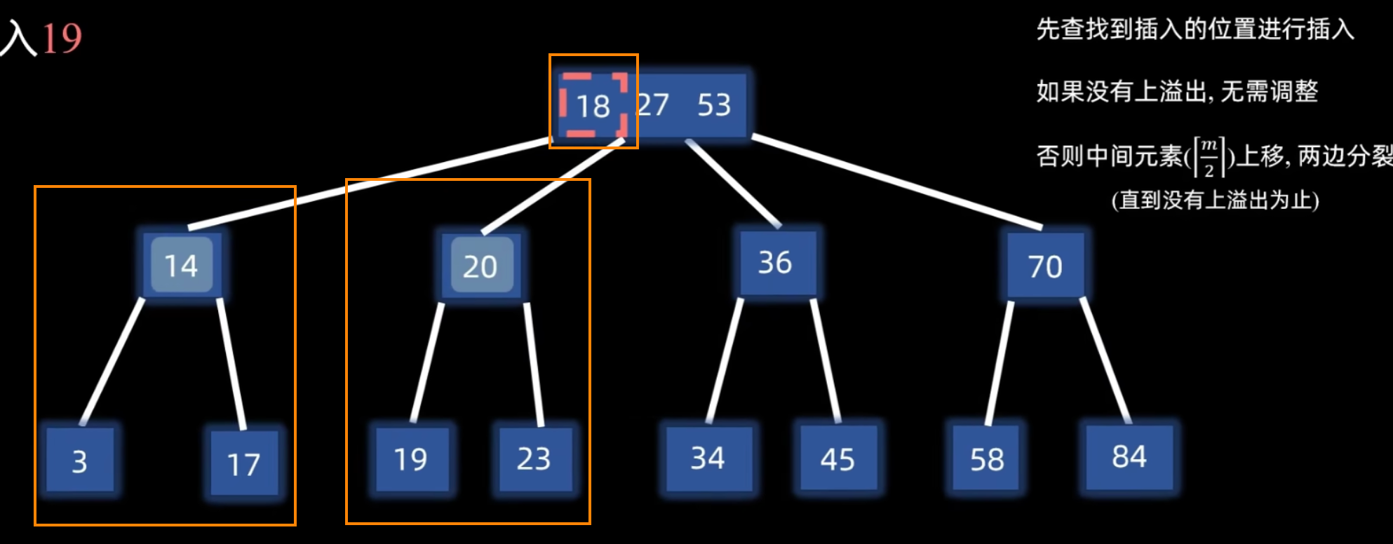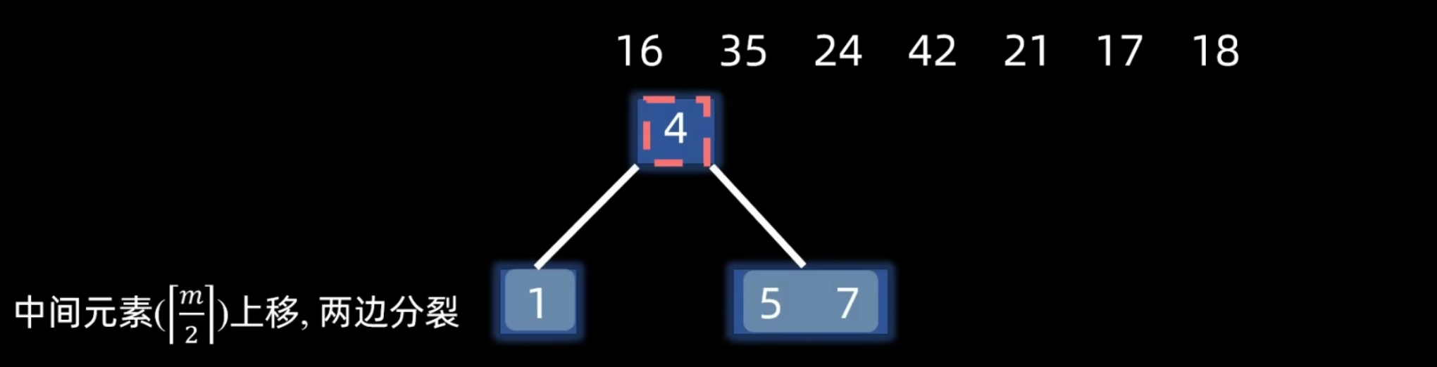 - 将该结点(包含新插入的关键字,共 个)从中间位置 分裂成两个新结点(分裂完成后变为左、中、右三个部分)。