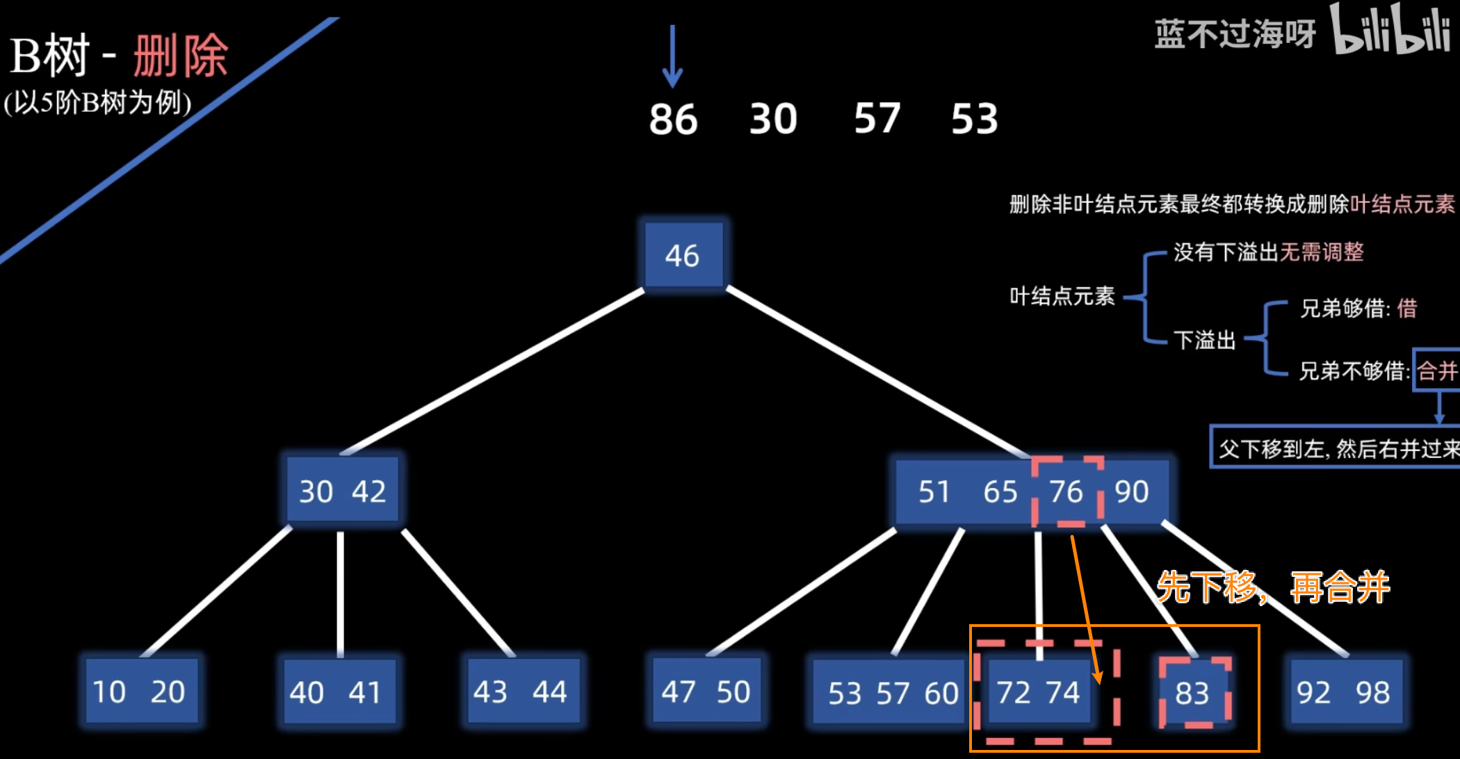 - 合并:若左右兄弟结点都无法借用(关键字数均为 ),则将当前结点、其一侧的兄弟结点以及父结点中分隔它们的关键字合并成一个新结点。