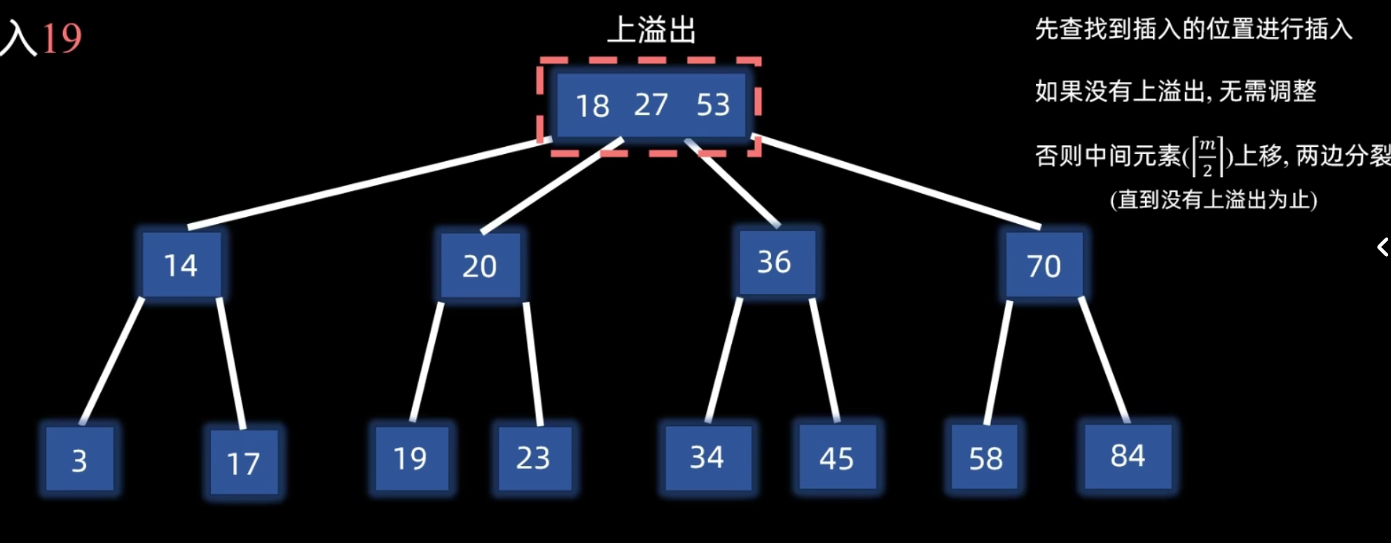 - 若该叶子结点中的关键字个数 ,插入后导致结点溢出 (Overflow)。
