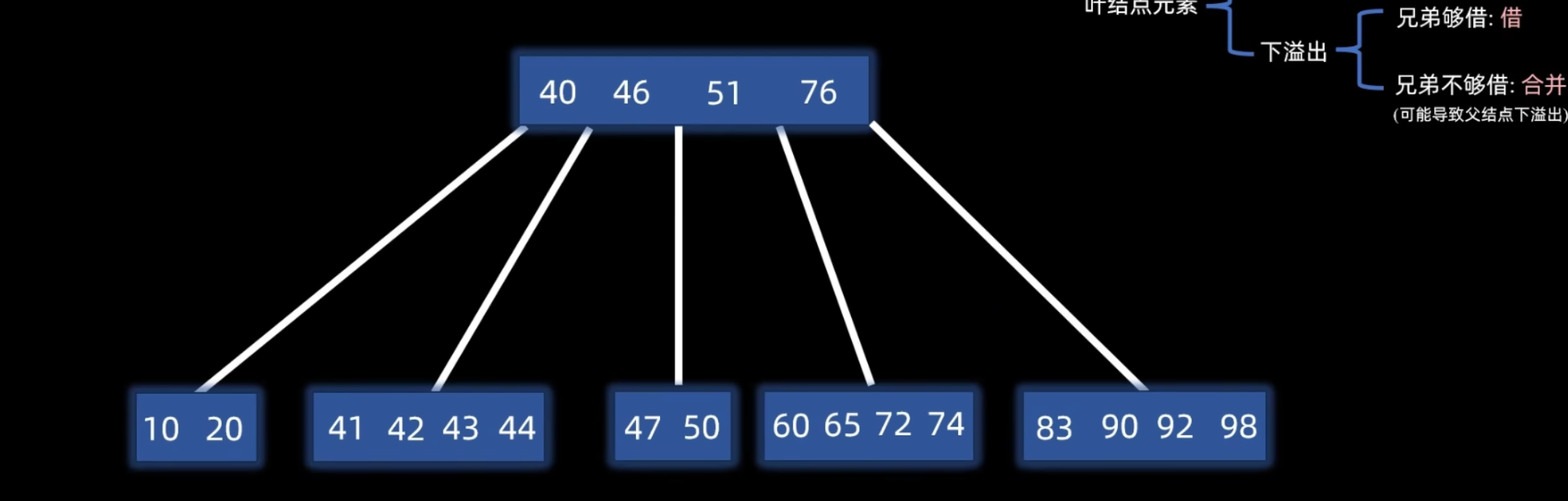 - 借用:检查其左右兄弟结点。若某兄弟结点关键字数 > ,则从该兄弟结点“借”一个关键字。具体操作是:将父结点中与该兄弟相邻的关键字下移到当前结点,再将兄弟结点中的一个相应关键字上移到父结点。