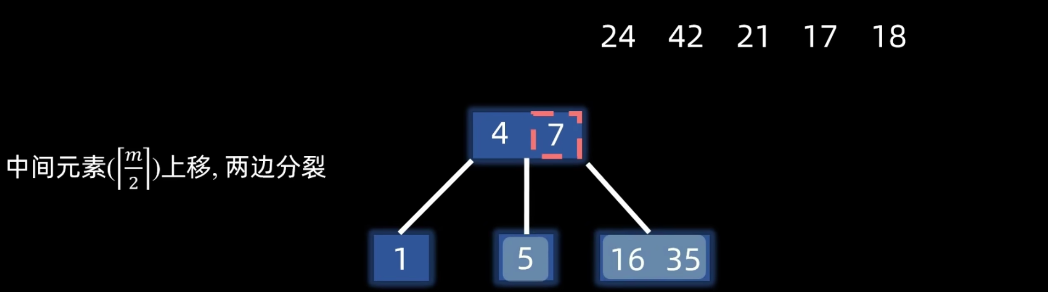 - 原结点的左半部分关键字留在原结点,右半部分关键字放入一个新创建的结点。