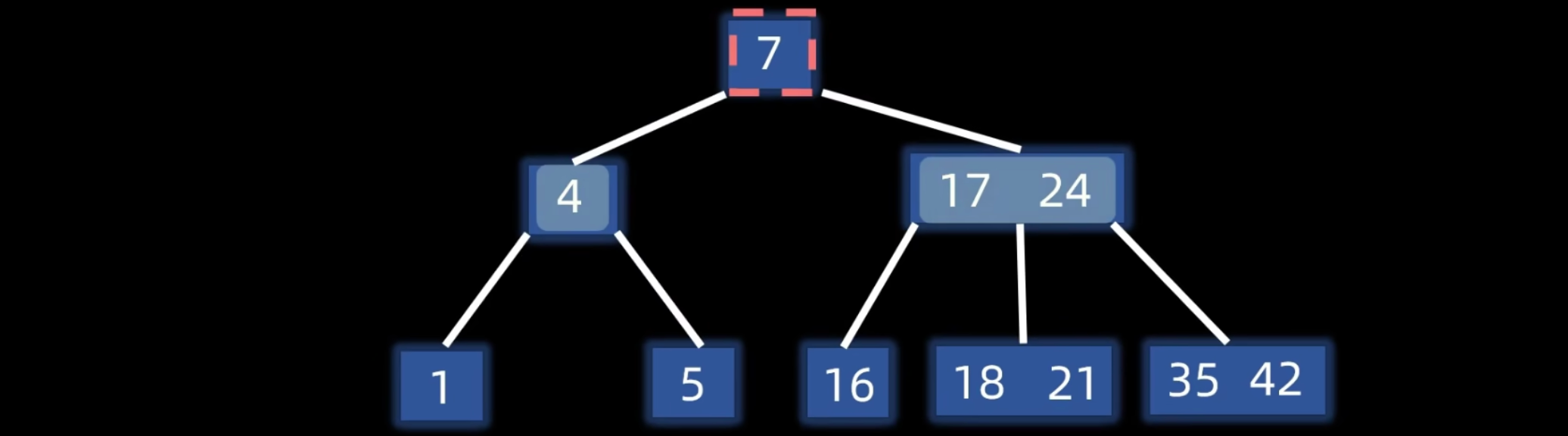 | 关键字分布 | 结点中每个关键字将其子树分成区间,左小右大,便于查找。 |