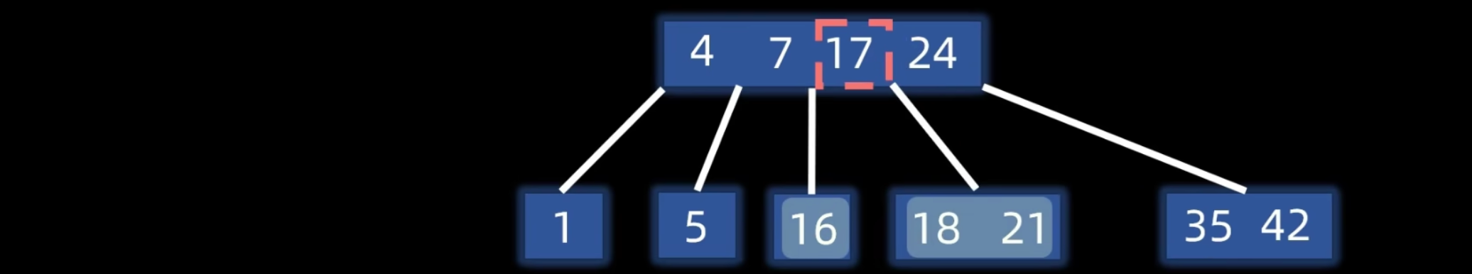 - 从根结点开始,在当前结点的关键字序列中查找目标值(可使用顺序查找或二分查找)。