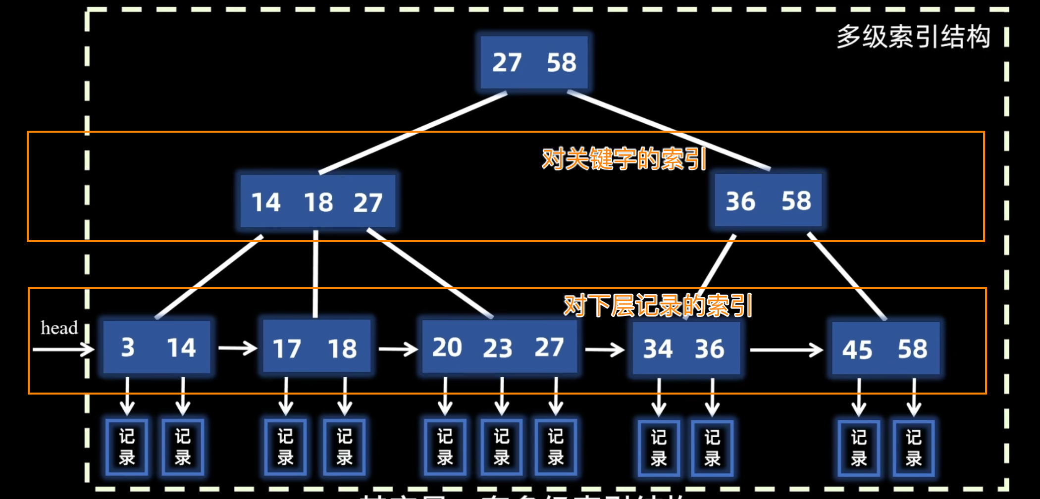 - 顺序访问:所有叶子结点通过指针相互链接,形成一个有序的链表(通常是双向链表)。这极大地提高了范围查询和顺序遍历的效率。