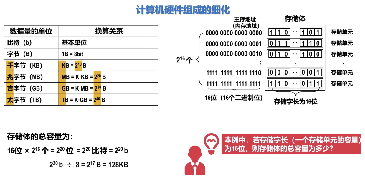 • 存储体:由大量存储单元组成,是实际存放数据和指令的物理介质。