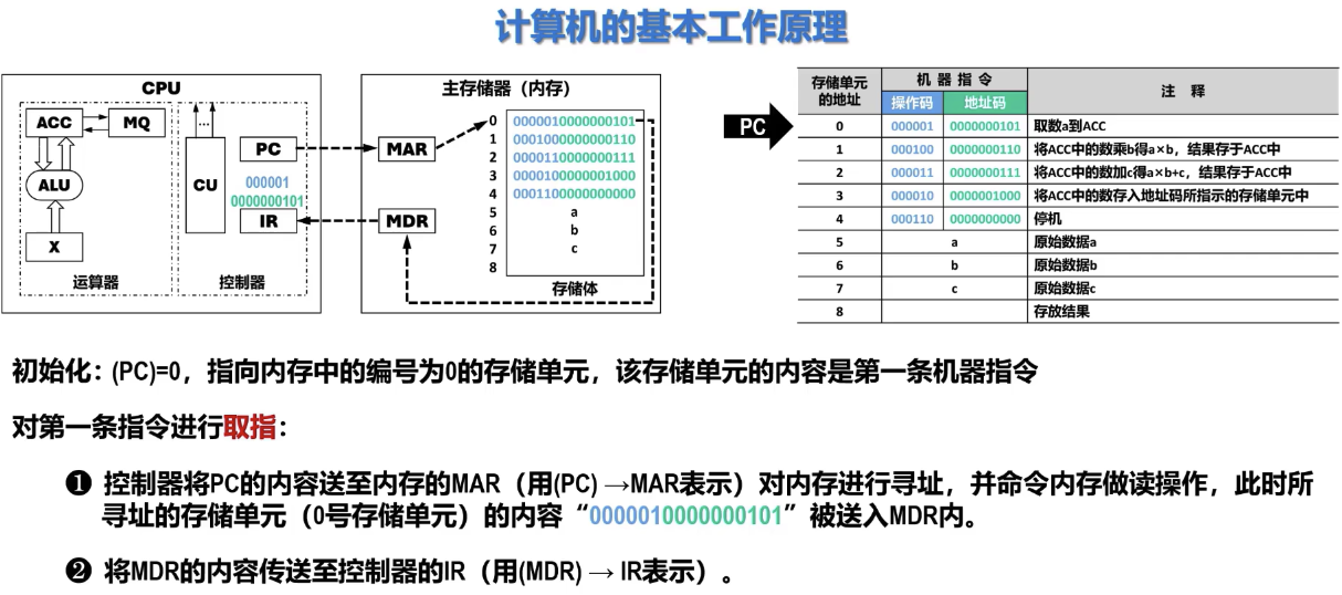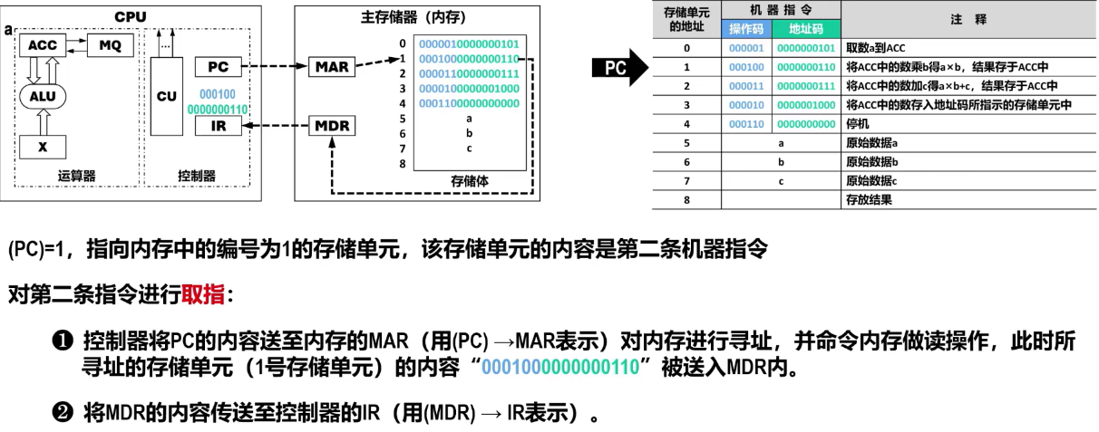 • 根据 PC (程序计数器) 中存放的地址,从主存储器中取出当前要执行的指令。