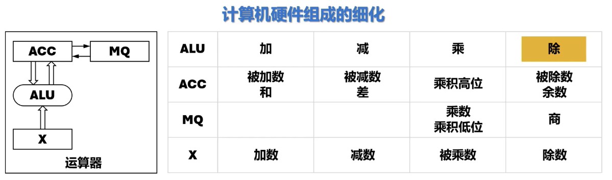 (ACC) / (X) -> MQ   # 将累加器中的被除数除以X中的除数,商存入MQ,余数保留在累加器ACC