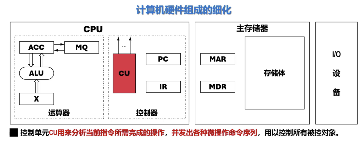 • CU (控制单元) 对 IR 中存放的指令的操作码进行译码,识别指令的类型和所需执行的操作。