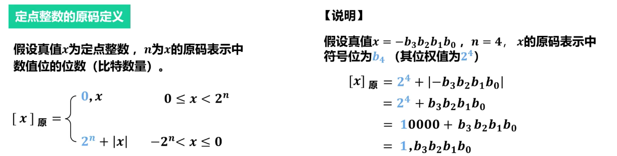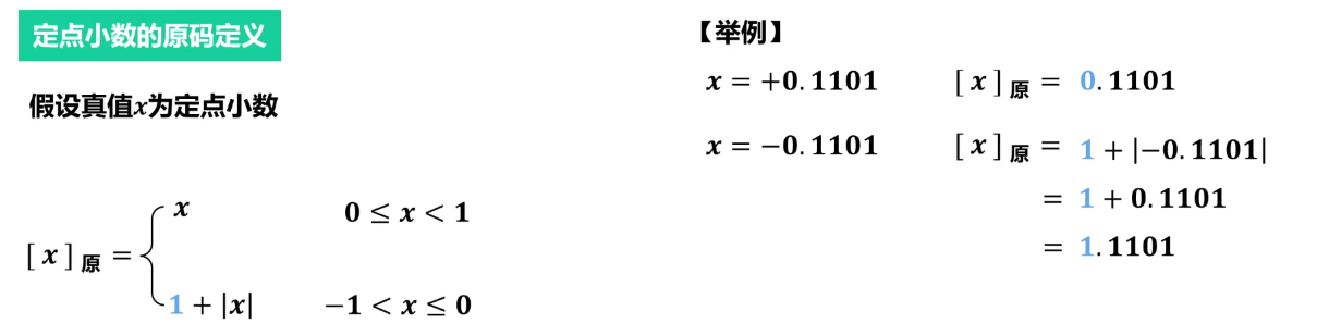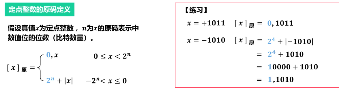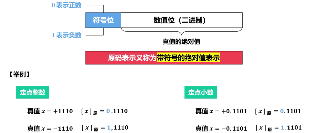 - 定义:最高位为符号位(0 表示正,1 表示负),其余位表示数值的绝对值。