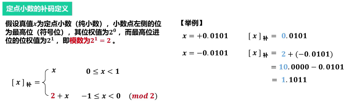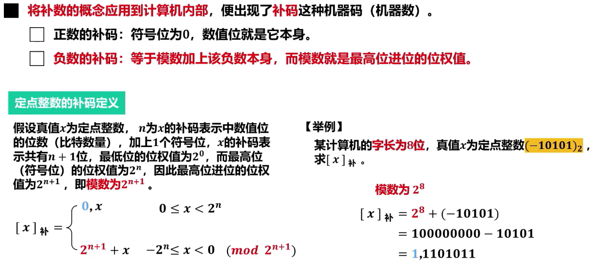 - 只有一个零的表示(00…0)。解决了原码和反码中“0”的重复表示问题。