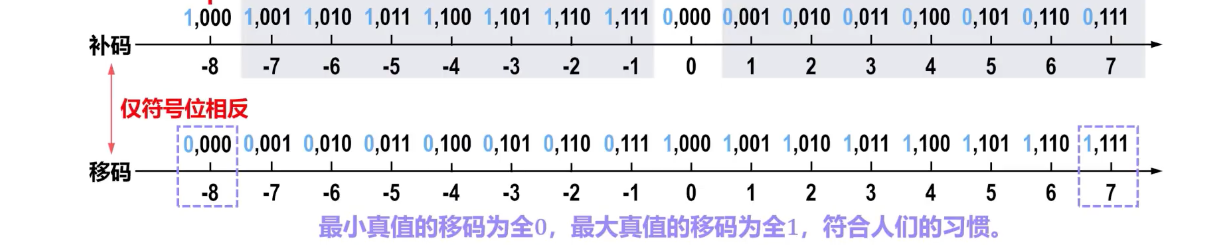 - 所有负数的移码的符号位为 0,所有非负数的移码的符号位为 1 (当 时)。这与补码的符号位相反。