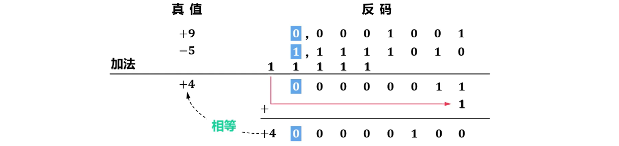 - 加法运算规则比原码简单,但当最高位有进位时,需要将进位加到最低位(“循环进位”)。