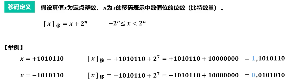 - 例如,对于 n 位移码,若 ,则真值 0 的移码是 ,即最高位为 1,其余为 0 (10…0)。