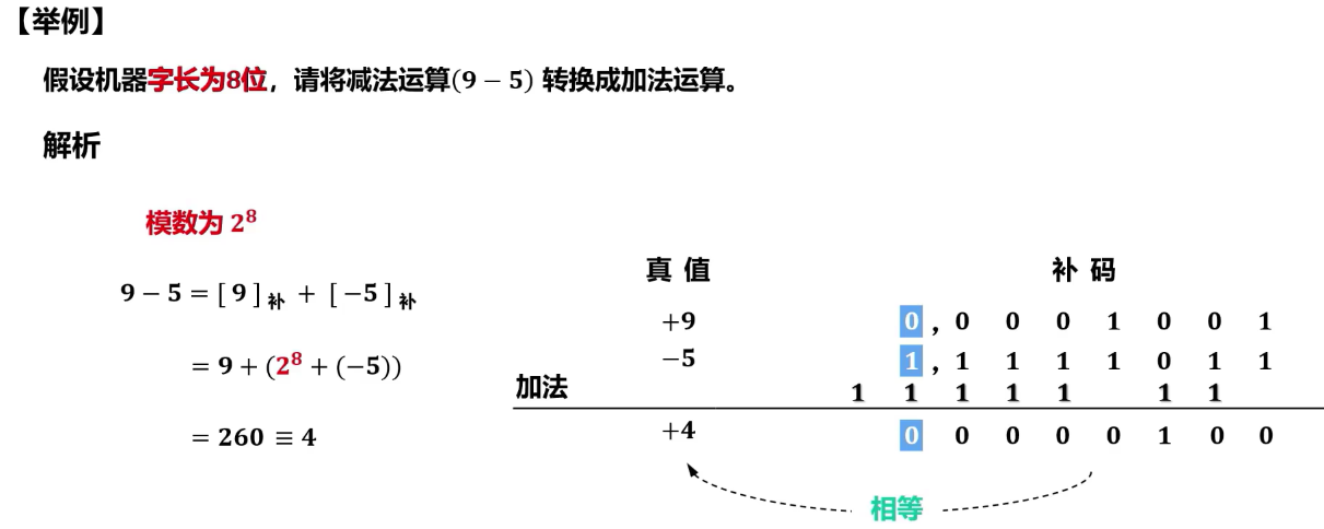 - 一个负数可以用它的正补数来替代,而这个正补数可以用模数加上负数本身求得