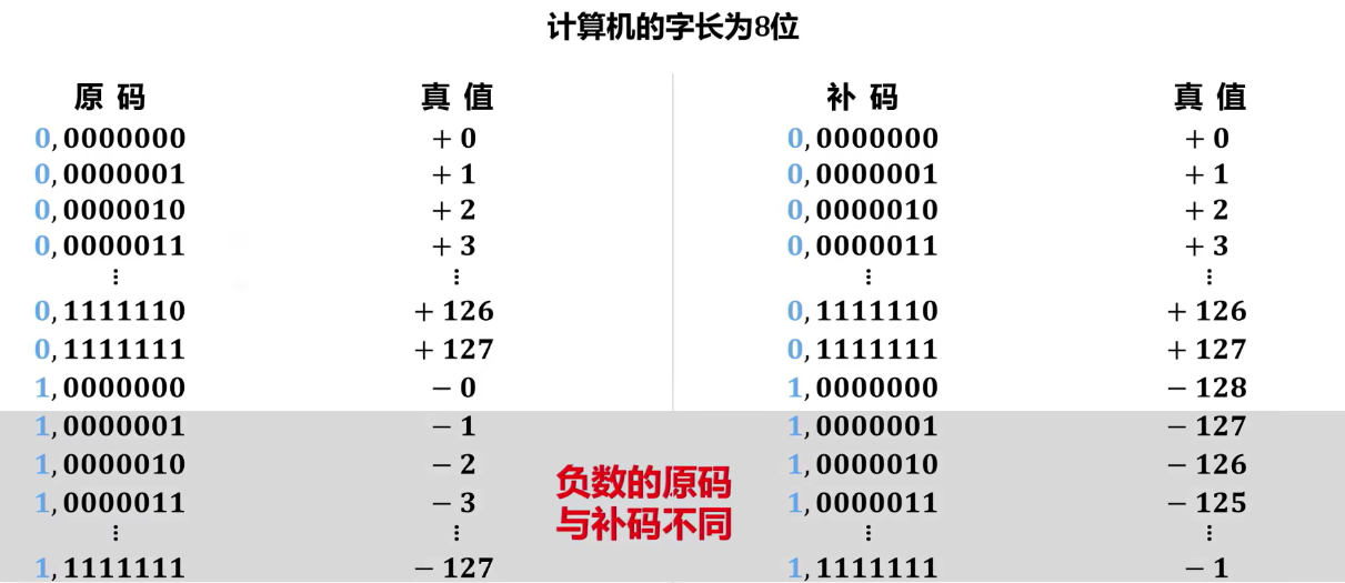 - 负数:符号位为 1,数值位与真值的绝对值相同。