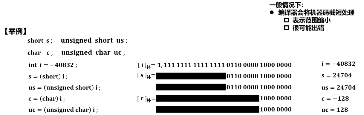 - 负数转换为无符号数: 负数的补码表示会被解释为一个大的正数。例如,-1 (int) 转换为