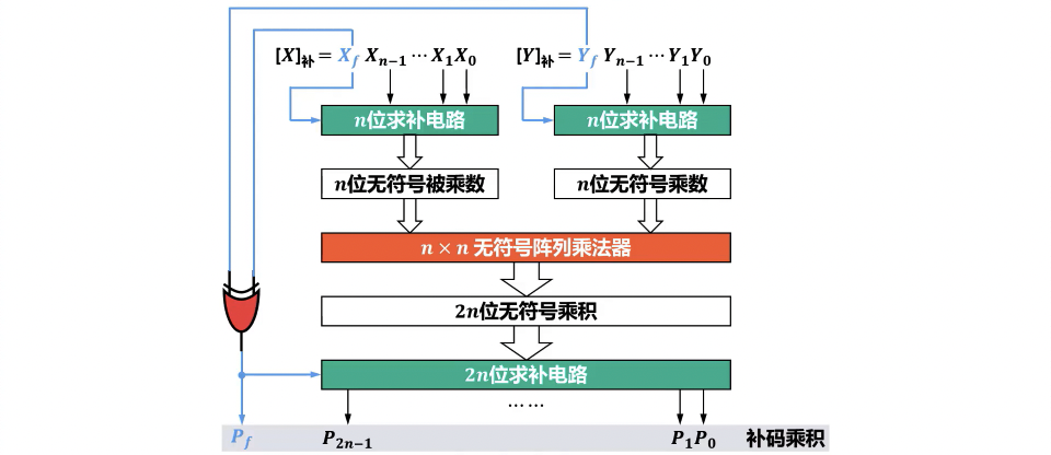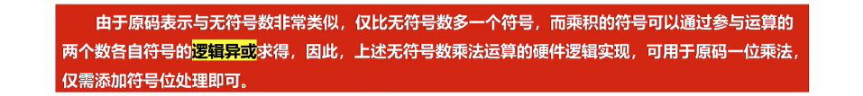 - 执行原码绝对值的无符号数一位乘法,最后对符号为进行同或即可