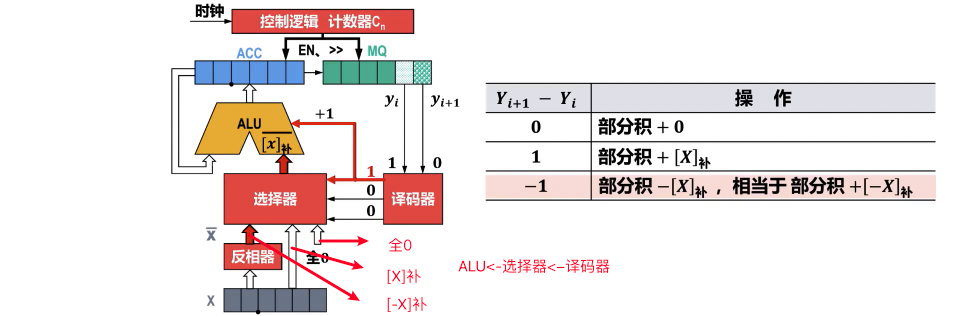 - Booth(布斯)算法:一种高效的补码乘法算法,通过检查当前乘数位 Q0 和附加位 Qn+1 的变化(00, 01, 10, 11)来决定对被乘数 进行加、减操作或不操作,并进行算术右移。该算法适用于正负数相乘,且结果为补码形式。