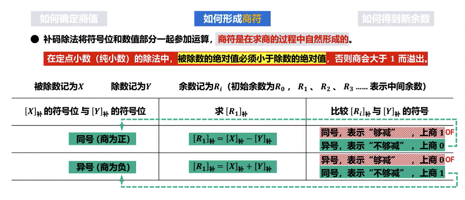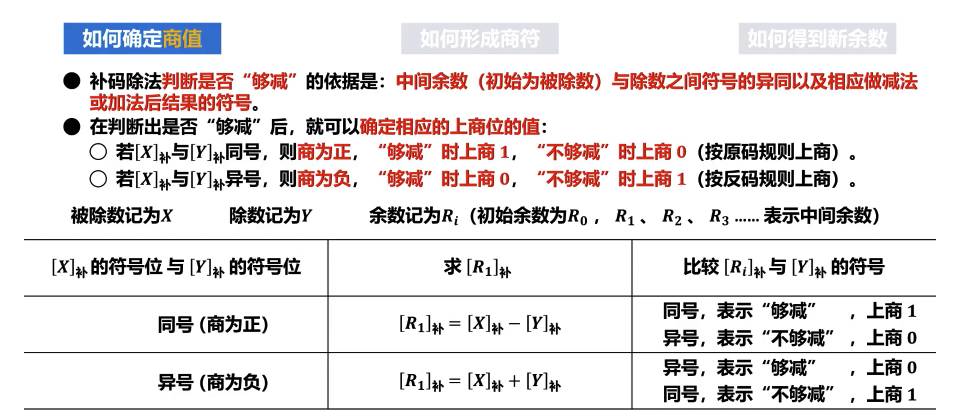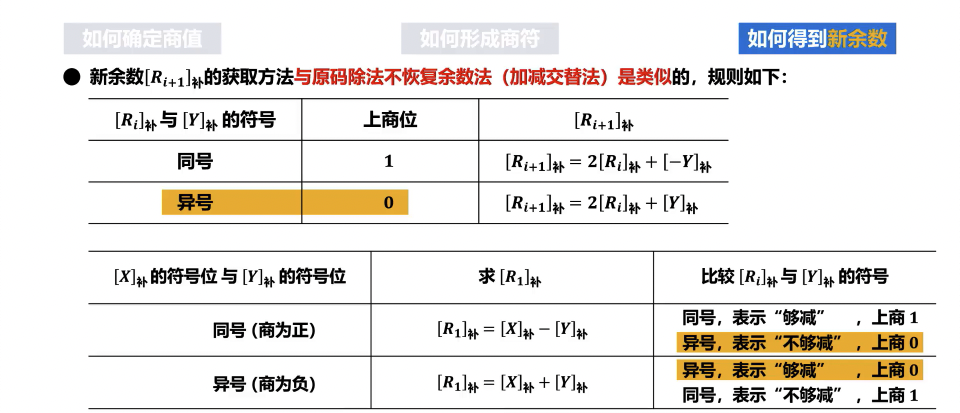 - 若操作后的新部分余数 A的符号与除数 D的符号相同,则当前商位为 1。