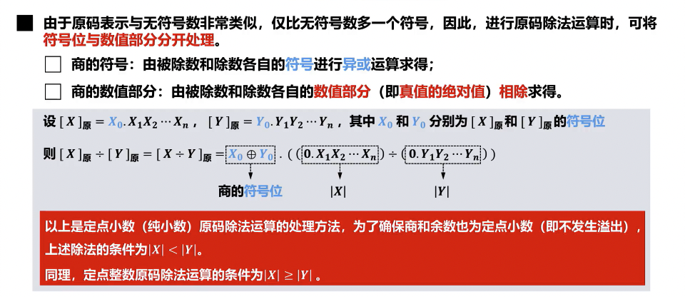A = A + D(加上除数 D);若 A 为正,则A = A + (-D)补(减去除数 D)。 - 校正后的余数 R 应满足:R 的符号与被除数 X 的符号相同,且 |R| < |D|。