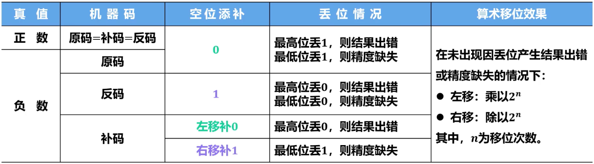 - 反码与原码相同,因此其算术移位规则也与原码正数的算术移位相同(右移高位补 0,左移低位补 0)。