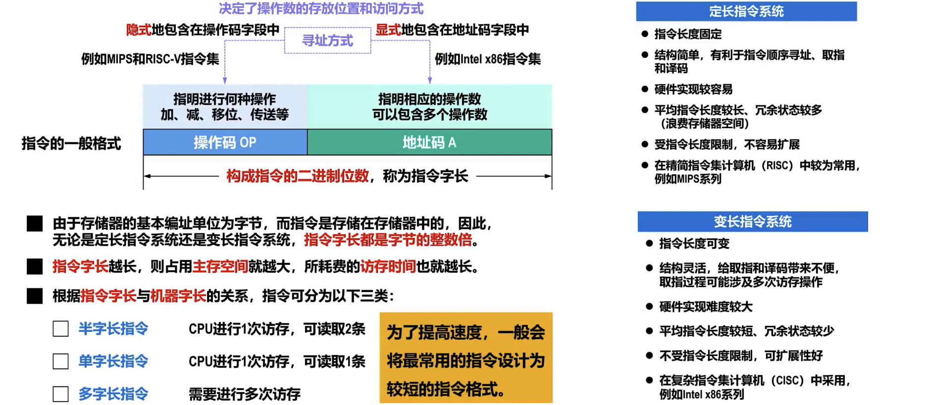 - 指令字长分类(按与机器字长关系):指令字长通常是字节的整数倍,与机器字长的关系影响取指效率和存储效率。