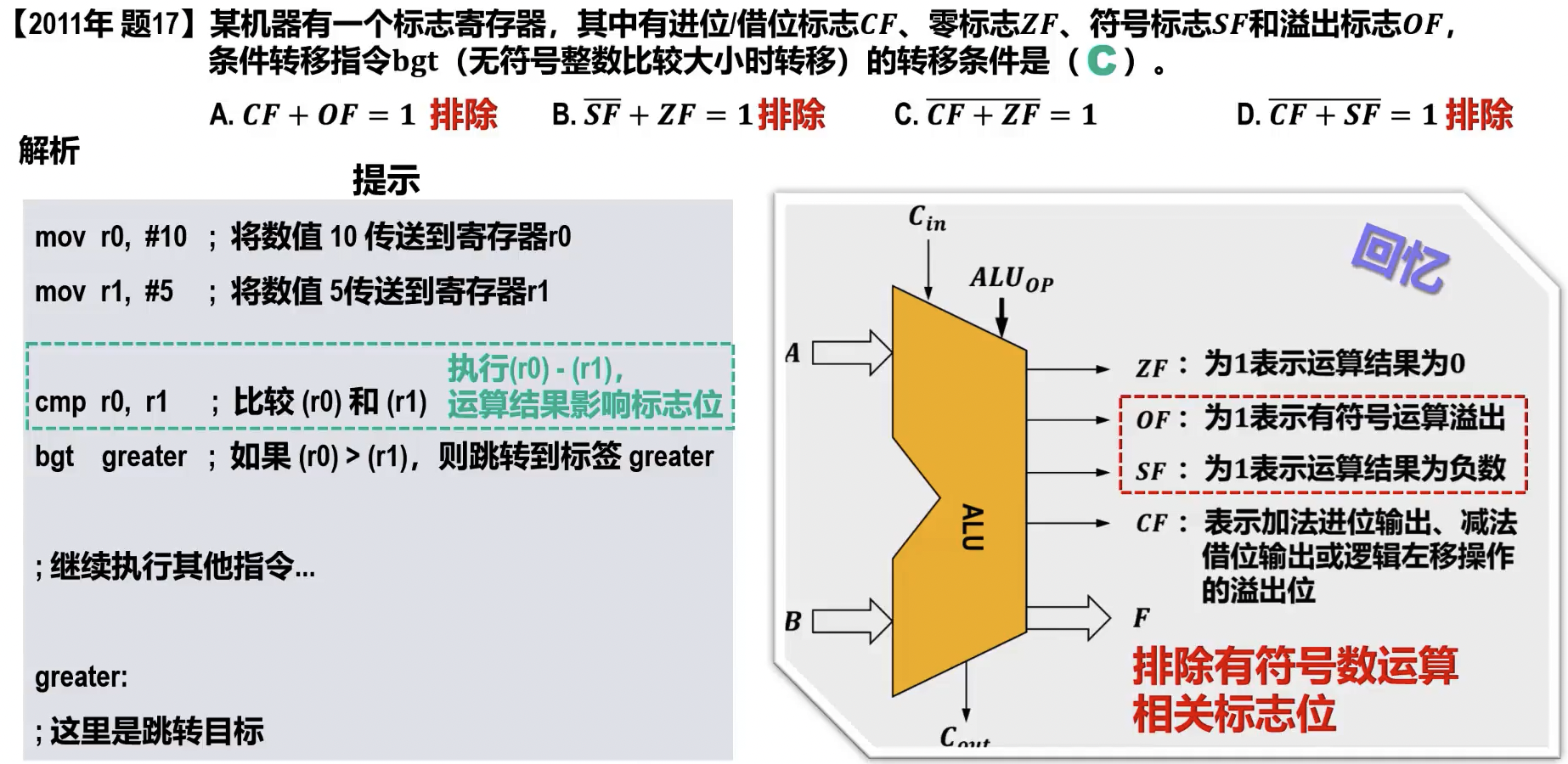 - 结果与标志位:运算结果通常存放在通用寄存器或存储器中,同时会影响 CPU 的状态标志寄存器(如 EFLAGS/PSW 中的进位标志 C、零标志 Z、符号标志 S、溢出标志 O 等)。
