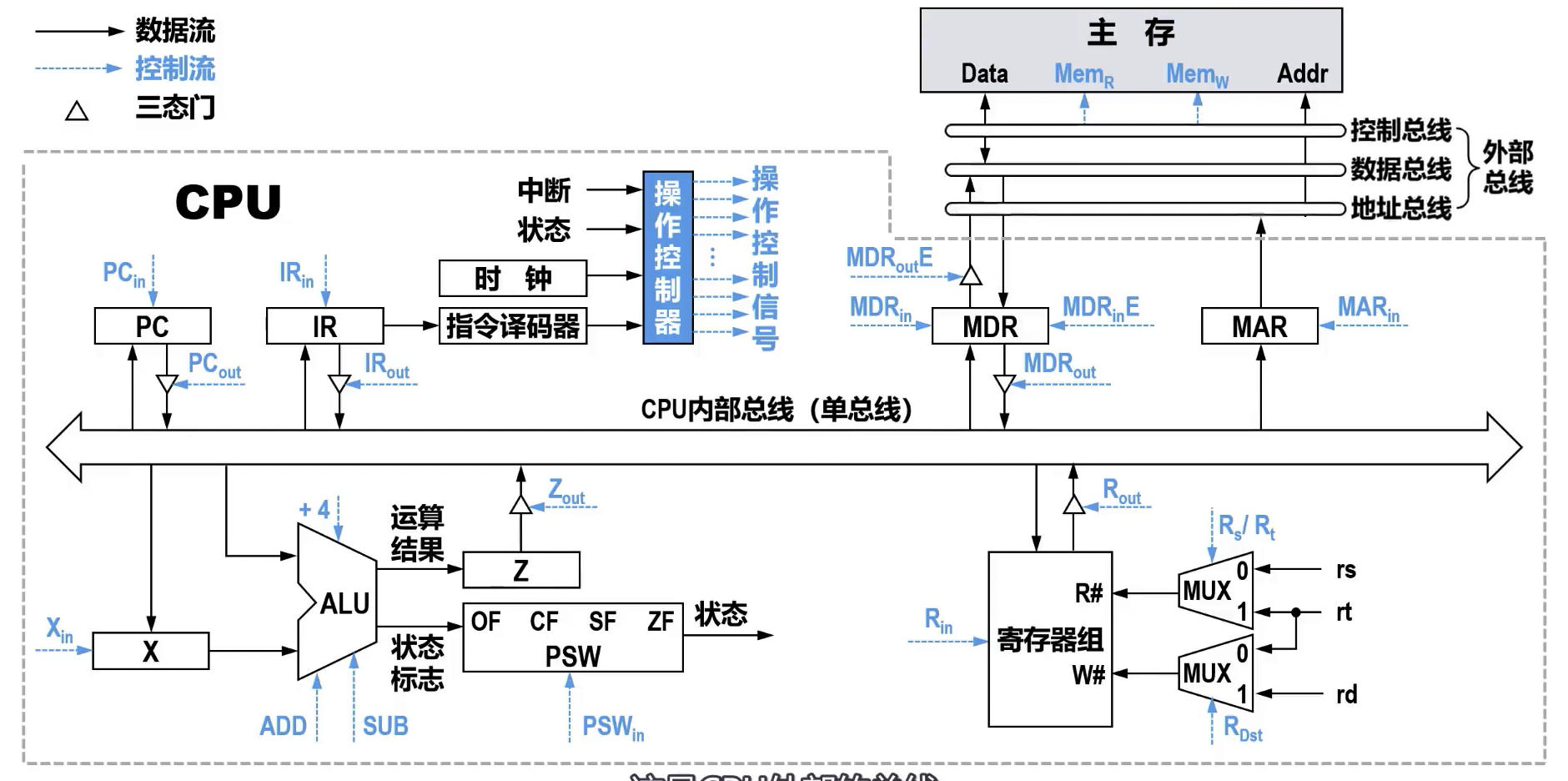 • 单总线数据通路将所有寄存器的输入输出端都连接在一条公共通路上,一个时钟内只允许一次操作,无法完成指令的所有操作