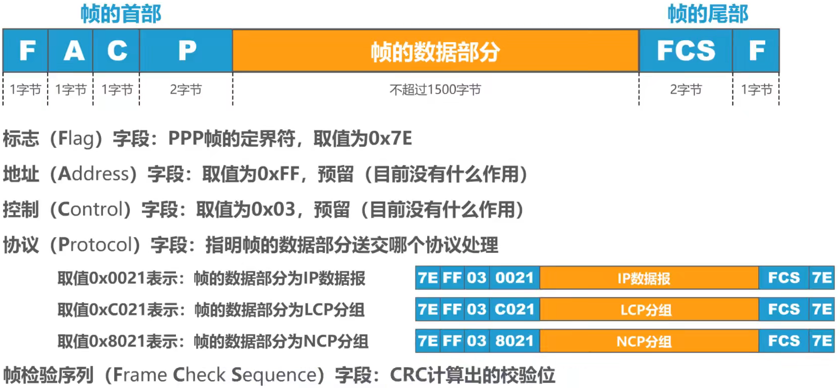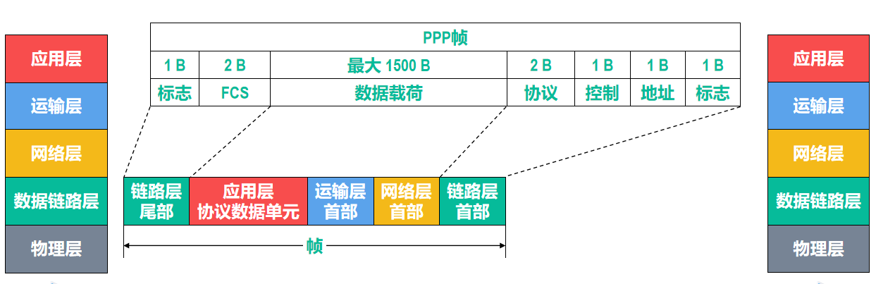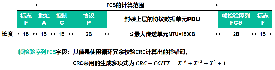 - PPP 是面向字节的,因此所有 PPP 帧的长度都是整数个字节