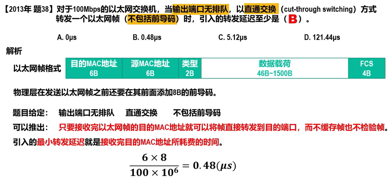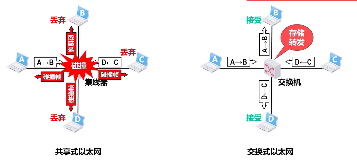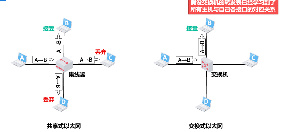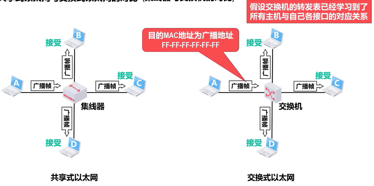 - 交换式以太网:交换机收到帧后,根据帧的目的 MAC 地址和自身的交换表将帧明确地转发给目的主机