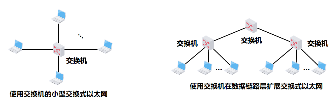 - 交换式以太网,交换机工作在数据链路层: