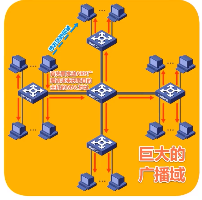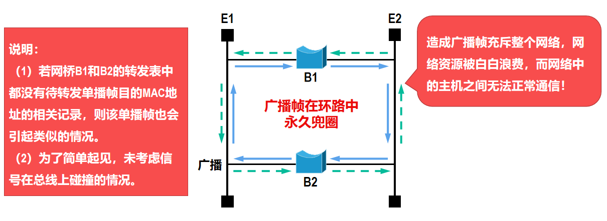 网络中的广播帧将在环路中永久兜圈,造成广播帧充斥整个网络,网络资源被白白浪费,而网络中的主机之间无法正常通信