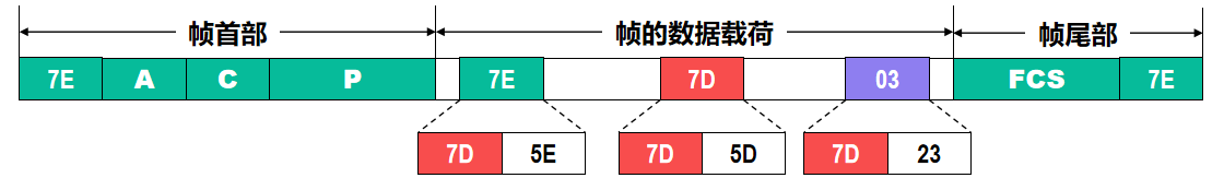 - 若数据载荷中原来就含有 0x7D,则把每一个 0x7D 减去 0x20,然后在其前面插入转义字符 0x7D,变成 7D5D